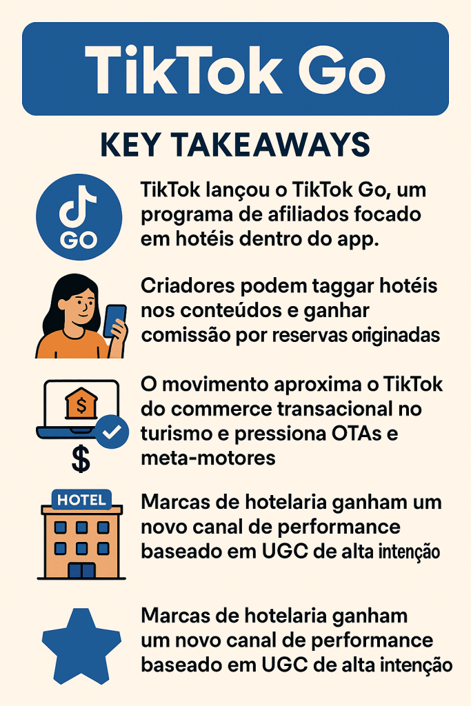TikTok lança “TikTok Go”, afiliados de viagens com tagging de hotéis e comissões. Oportunidades para marcas, OTAs e criadores.